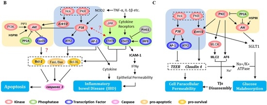 In a word, our results suggest that four distinct events might occur after IPEC-J2 cell exposure to DON. (1) Apoptotic pathways, including p38→ATF-2/AP1, and STAT1/STAT3 are activated whereas the Erk1/2→Akt survival pathway is inhibited. This might be followed by Bcl-2 protein downregulation and caspase-3 activation (Figure 6B); (2) p38/Erk1/2 alters the expression of claudin-4 and TEER, which increases paracellular permeability. This effect is reinforced by PKC/MLC2 interactions and a decrease in AF-6 phosphorylation, which might affect the TJ assembly (Figure 6C); (3) p38→AP1 or STAT1→cytokine pathways might be triggered, leading to intestinal inflammation. The STAT1→ICAM-1 system is associated with the response to bacterial infections. They all toward a Th1 response, that is likely to be associated with the pathogenesis of IBD (Figure 6B); (4) SGLT-1 activity might be regulated by PKC, affecting the downstream signal cascades MAPKs and PI3K/Akt. Impairment of the Na+ gradient across the intestinal paracellular barrier might occur as a result of TJ protein downregulation, and glucose malabsorption follows (Figure 6C).