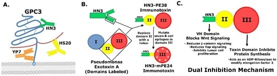 Overview of immunotoxin design. (A) Representation of anti-GPC3 antibodies and their approximate binding sites. YP7 and HN3 bind to the core protein near the C-terminus and a conformational epitope that requires both the N-terminus and the C-terminus, respectively. HS20 binds directly to the heparan sulfate chains associated with GPC3; (B) Construction of HN3-PE38 and the second generation HN3-mPE24; (C) HN3 immunotoxin domains and their associated functions.