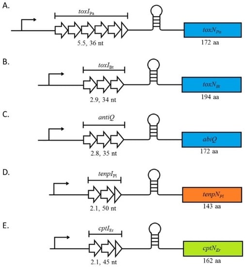 Antitoxin repeats are a key feature of Type III systems. The number of repeats varies between systems and they have been shown to be crucial for antitoxin activity. For instance, the antitoxins of the ToxINPa, ToxINBt, and AbiQ systems that belong to the ToxIN family, all diverge at the primary sequence level and number of repeats, while the length of the monomers is quite conserved. ToxIPa, ToxIBt, and antiQ sRNAs are composed of, respectively, 36 nucleotides repeated 5.5 times, 34 nucleotides repeated 2.9 times, and 35 nucleotides repeated 2.8 times (Figure 1). In vitro, the antitoxin activity can be retained despite increasing or decreasing repeat numbers. However, the range of repeats in which each antitoxin remains functional varies. For instance, 2.5 repeats from 5.5 were necessary and sufficient for ToxIPa antitoxin to inhibit its toxin [] while at least 1.8 repeats from 2.8 were essential for the antitoxin activity of antiQ []. antiQ mutants containing 1.8 and 3.8 repeats were readily obtained while clones with only 0.8 of a basic repeat were inviable, suggesting that an incomplete repeat sequence is insufficient to avoid toxicity of AbiQ []. In addition to its TA function, the AbiQ system also acts as an abortive infection system against some phages (See below, Section 6.1). This activity is also affected by the number of antiQ repeats however the anti-phage activity of the system is altered independently of its toxin neutralising activity. For instance, deletion or addition of one repeat to antiQ decreased the phage resistance provided by the AbiQ system, indicating that the length of the wild-type antiQ is critical for optimal anti-phage activity. Similarly, mutations in key residues for antitoxin processing led to significant loss of anti-phage activity while a point mutation that affects pseudoknot structure increased anti-phage activity, but did not affect bacterial fitness [].