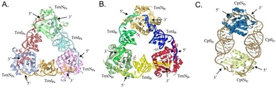 Most of the structural data currently available concerns the ToxIN subfamily. The quaternary structure of the ToxINPa and ToxINBt systems has been resolved (Figure 2A,B) and bioinformatic analyses predict that the AbiQ system shares the same quaternary architecture [,,]. These crystal structures provided important insights into the mechanism of RNA anti-toxicity.