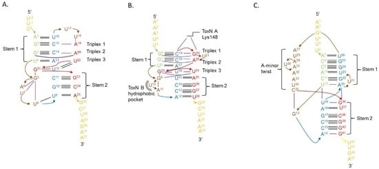 All the antitoxins crystallised so far adopt a pseudoknotted fold in their TA complexes. Pseudoknots are a recurrent RNA structural motif in which a loop forms interactions with distal bases outside the loop to form triple stranded structures. Usually the third nucleotide is an adenine enabling A-minor interactions []. In the quaternary structures of the TA systems, the antitoxin pseudoknots exhibit three distinct regions that interact with each other through duplex and triplex hydrogen bonds (Figure 3) [,]. An important feature is the core of the pseudoknot which contains three internal base triplexes. One of these internal base triplexes (triplex 3, GUU) separates the two based-paired stems of the pseudoknot with interdigitation of a guanine (Figure 3A,B). While key components are conserved in both ToxI pseudoknots, this curious structural aspect was not predicted due to the low sequence homology between the antitoxins. Despite overall similar structures, the RNA-protein interfaces show substantial differences as highlighted by the selective inhibition displayed by both antitoxins and the absence of functional cross-talk between antitoxins and toxins of the Pectobacterium and Bacillus systems [].