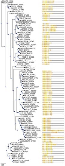 Phylogenetic tree based on representative toxins of putative Type III TA systems associated with the consensus repeats of the antitoxins: adenine (grey), guanine (white), cytosine (yellow), and uracil (orange). Toxin protein sequences were aligned using MUSCLE []. The tree has been constructed using PhyML and nearest neighbour interchange [,] and the figure has been made using Ete3 [].