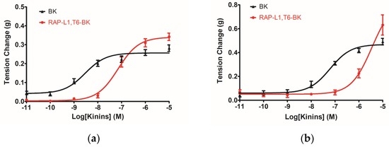 The following are available online at www.mdpi.com/2072-6651/8/10/283/s1, Figure S1: Dose–response curves of administration of BK and BRPs using rat arterial smooth muscle. Figure S2: MALDI-TOF (Perceptive Biosystem, Bedford, MA, USA) mass spectrum of synthetic peptide RAP-L1, T6, L8-BK.