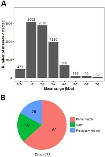 De novo assembly of RNA-Seq data using Trinity software generated 79,804 transcripts. Proteomic analysis of the scorpion Mesobuthus martensii has been reported before and proteins from this species were isolated by 2-DE, SDS-PAGE, and RP-HPLC []. In order to focus on peptides, fractions with mass weight less than 10 KD (identified by MALDI-TOF MS) were analyzed to uncover the complexity of the venom. The small peptides were detected on a Prominence Nano-HPLC system coupled with Q-Exactive. As shown in Figure 1, most of the fragments (peptide precursor ions detected by LS/MS) have molecular weights from 1000 to 5000 Da, and only a few fragments are larger than 5000 Da. This study focused mainly on peptide toxins and larger proteins (> 10 KD) were filtered manually. The molecular weight of peptides ranges from 0.7 to 8 KD (Figure 1A). The number of peptides with molecular weight from 0.7 to 1, 1 to 2, 2 to 3, 3 to 4, 4 to 5, 5 to 6, 6 to 7, and 7 to 8 KD were 473, 3062, 2870, 1980, 688, 144, 92, and 32, respectively. This indicates that most of peptides are small fragments. Finally, 708 unique peptides were identified and 153 proteins were identified by the two analysis methods (Tables S1 and S2). Among the identified proteins, 26 toxins showed the same sequence to BLAST results, 97 proteins were partially matched, and 30 were novel venom proteins unknown before (Figure 1B).