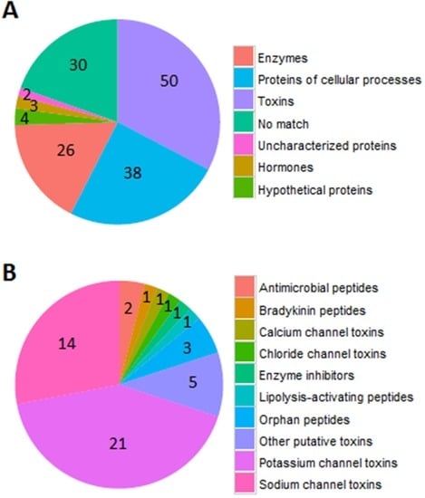 The function of identified toxin proteins. (A) The different functions of proteins, including toxins, cellular process proteins, enzyme, hypothetical proteins, hormones, uncharacterized and unknown proteins, are in different colors; (B) The number of different functional proteins from 50 toxins. 21 proteins target potassium channels, 14 proteins have activity on sodium channels, 5 proteins are putative toxins, three are orphan peptides, 2 are antimicrobial peptides, 1 is a calcium channel toxin, 1 is a lipolysis-activating peptide, 1 is bradykinin, 1 is a chloride channel toxin, and 1 is an enzyme inhibitor.