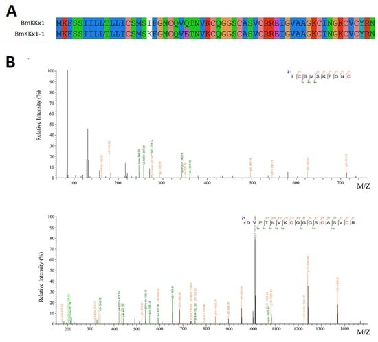 Identification of a novel toxin BmKKx1-1. (A) Sequence alignment of two homologs. The alignment of sequences was based on the results of MEGA; (B) Seven y-ions and three b-ions were identified from the upper MS/MS spectra, and 15 y-ions and eight b-ions were identified from the lower MS/MS spectra. The spectral images were generated using pLabel (http://pfind.ict.ac.cn/software/pLabel/index.html).