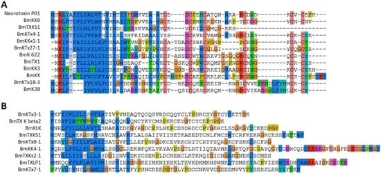 Scorpion venom contains a larger number of peptide toxins, which show diversity in structure and biological activity. Hundreds of proteins have been reported, including the inhibitors of the potassium channel, sodium channel, and chloride channel, antimicrobial peptides, lipolysis-activating peptide, and bradykinin []. Such a wide range of peptides and proteins with different biological functions make scorpion venoms a valuable source of new compounds both for use in basic research and for the development of new medicines []. It also stimulates us to thoroughly investigate the diversity of the scorpion toxins of M. martensii.