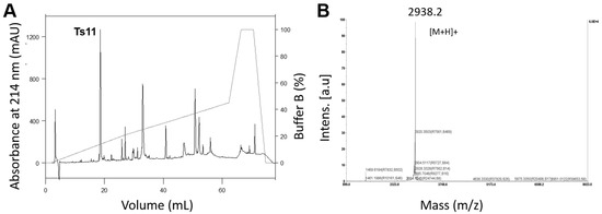 Ts11 isolation procedure and molecular mass determination. (A) Reversed-phase fast protein liquid chromatography (RP-FPLC) profile of fraction XIIA from Tityus serrulatus venom on a C8 column; (B) Mass spectra of Ts11 was obtained through MALDI-TOF mass.