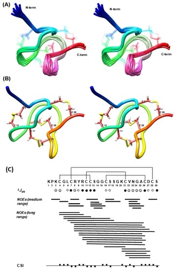 All structure calculations were performed by using Xplor-NIH program, version 2.25 (National Institutes of Health Bethesda, Bethesda, MD, USA) [32]. A set of 100 structures was generated by torsion angle molecular dynamics, starting from an extended strand and by using only NMR-derived restraints, excluding any disulfide restraints. After the torsion angle molecular dynamics round [33], the majority of the structures had converged to very similar structures with similar total energies and with no violations of the NOE and dihedral restraints. In the initially derived structures all the disulfide bonds could be identified unambiguously by the observation of side chain proximity of eight Cys residues. Torsion angle molecular dynamics round was repeated for the second time including both the disulfide bond and NMR-derived restraints. The fifteen lowest energy structures from the second round were used for further refinement during a “gentle molecular dynamics” round in explicit water [34]. A box of water was constructed and optimized around selected structures obtained from the second torsion angle dynamics step. The final stage of refinement commenced with a 20 ps constant temperature molecular dynamics simulation at 300 K (20,000 steps of 0.001 ps) and was followed by a 200-step conjugate gradient energy minimization of the average structure of the last 10 ps of the 20 ps simulation. Structures were analyzed by using PROCHECK [35]. Visual representations were created by using UCSF Chimera software (version 1.9, University of California, San Francisco, CA, USA).