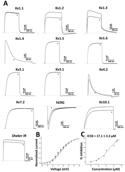 The electrophysiological study of Ts11 was performed on voltage-gated sodium and potassium channels, Nav and Kv respectively. Both peptides were tested on different Kvs. Ts11, at 3 μM, showed a blocking effect on Kv1.2 (25%), Kv1.3 (27%), Kv4.2 (25%), Kv10.1 (15%), hERG (12%), and Shaker IR (10%) (Figure 3A).