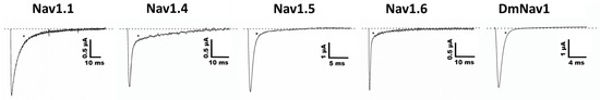 For the expression of the voltage gated potassium channels (rKV1.1, rKV1.2, hKV1.3, rKV1.4, rKV1.5, rKV1.6, Shaker IR, rKV2.1, hKV3.1, rKV4.2, hERG, KV10.1) and the voltage gated sodium channels (rNaV1.1, rNaV1.4, hNaV1.5, mNaV1.6 and DmNav1) in Xenopus oocytes, the linearized plasmids were transcribed using the T7 or SP6 mMESSAGE-mMACHINE transcription kit (Ambion, Waltham, MA, USA). The harvesting of stage V–VI oocytes from anaesthetized female X. laevis frog has been previously described [27]. Oocytes were injected with 30–50 nL of cRNA at a concentration of 1 ng/nL using a micro-injector (Drummond Scientfic, Broomall, PA, USA). The oocytes were incubated in a solution containing (in mM): NaCl, 96; KCl, 2; CaCl2, 1.8; MgCl2, 2 and HEPES, 5 (pH 7.4), supplemented with 50 mg/L gentamycin sulfate.