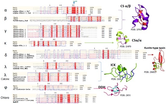 Amino acid sequence alignments and identities (%) among Ts11 and representatives of α-β-γ-κ-δ-λ-KTx-subfamilies, λ-KTx/calcine toxins, ϕ-liotoxin-Lw1a and chlorotoxins; and representatives of the five different structural folds adopted for scorpion toxins affecting KvsAlignment performed using ClustalW and MultAlin. The structures were created using Pymol and PDB database.
