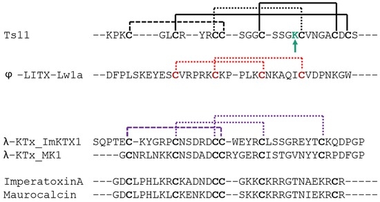 An extensive primary sequence comparison of Ts11 with other described toxins was performed. We aligned Ts11 with several toxins selective for voltage-gated potassium channels to all the currently known classes: α-β-γ-κ-δ-KTx, λ-KTx (ImKTx1 and λ-MK1, which are two scorpion toxins sharing the ICK motif and are functionally characterized as Kv blockers [2]), λ-KTxs/calcine toxins (Imperatoxin A, Maurocalcin and Opicalcine1 which are scorpion toxins sharing the ICK motif and are active on ryanodine receptors), ϕ-liotoxins-Lw1a [20,21]) and additionally the chlorotoxins (which also have vicinal cysteines in common with Ts11) (Figure 5). Although Ts11 was previously classified as a KTx, this toxin shows less than 50% of identity with all the subfamilies of KTx, α-β-γ-κ-δ- KTx. Even for γ and δ-KTx, which possess vicinal cysteines like Ts11, the identity remains between 30% and 48%. We also compared Ts11 with ICK type scorpion toxins, λ-KTx and λ-KTx/calcine, which share identities between 20% and 30%. Ts11 poorly shares identity (21%) with ϕ-liotoxins-Lw1a. Chlorotoxins showed identity around 41%–44% with Ts11.