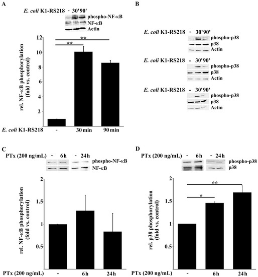 Recently we showed that PTx exhibited host cell signaling events similar to those induced by E. coli K1-RS218, resulting in increased translocation and invasion of the pathogen across the blood–brain barrier (BBB) [17]. Whereas in our previous study we focused on cell-cell adhesion signaling pathways, here we investigated whether PTx also promotes the activation of the stress-regulated MAPK p38, NF-κB and the transcription of their downstream targets. As primary human cerebral microvascular endothelial cells are not available in sufficient and reliable amounts, we had to resort to a tissue culture model employing stable human brain-derived microvascular endothelial TY10 cells [42,43] as an established surrogate. All assays were done with confluent cells under identical conditions. Western blotting analysis was performed to determine the effects of PTx and E. coli K1-RS218 on the activation of the MAPK p38 and NF-κB (Figure 1). Infection of TY10 cells for 30 min or 90 min with the bacteria led to a several fold increase of NF-κB and p38 phosphorylation (Figure 1A,B). Fold values were obtained by comparison of values obtained by Western blotting in stimulated cells vs. values obtained for non-stimulated cells. Values for non-stimulated cells were arbitrarily set to 1. Application of PTx for 6 h and 24 h, however, had no effect on the phosphorylation of NF-κB (Figure 1C). In contrast, we found a significant increase in p38 phosphorylation already 6 h after PTx application (1 vs. 1.46 ± 0.02), which was still detectable after 24 h (1 vs. 1.62 ± 0.14) (Figure 1D). Compared to E. coli K1-RS218-induced activation after 30/90 min, p38 phosphorylation induced by PTx was modest but still present after 24 h.