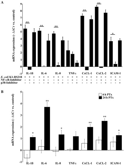 Long-term application of PTx enhances the expression of IL-1β, IL-6, IL-8, CxCL-1, CxCL-2 and ICAM-1 in TY10 cells. (A) qRT-PCR analysis of E. coli K1-RS218 (MOI 100, 90 min) infected TY10 cells shows significantly increased levels of IL-1β, IL-6, IL-8, CxCL-1, CxCL-2 and ICAM-1 mRNA, but had no effect on TNFα mRNA levels. Application of the NF-κB inhibitor Bay 11-7082 (Bay; 10 µM) completely abolishes increased cytokine and chemokine expression levels, while application of p38 MAPK inhibitor SB203590 (10 µM) had no effect; (B) Treatment of TY10 cells with PTx (200 ng/mL, 6 h) does not affect IL-1β, IL-6, IL-8, TNFα, CxCL-1, CxCL-2 and ICAM-1 mRNA levels. In contrast, 24 h application of PTx (200 ng/mL) significantly enhances the mRNA levels of all examined genes. Bars represent the mean ± SEM of at least three independent experiments performed in duplicates. * p < 0.05; ** p < 0.01 (determined by ANOVA followed by Bonferroni post hoc test). (A) Only significant differences are shown comparing E. coli K1-RS218 samples with E. coli K1-RS218 + Bay 11-7082/SB203590 inhibitors; (B) Only the significances treated vs. untreated cells are given. +: with indicated treatment; −: without indicated treatment.