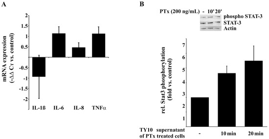 The supernatant of PTx-treated TY10 cells induces enhanced expression of cytokines and phosphorylation of STAT3 in THP-1 cells. (A) Differentiated THP-1 cells (PMA, 1 µg/mL, 24 h) showed increased mRNA expression of pro-inflammatory cytokines IL-6 and TNFα after 3 h of incubation in the supernatant collected from TY10 cells treated with PTx (200 ng/mL, 24 h); (B) Incubation of differentiated THP-1 cells with supernatant of PTx-treated TY10 cells (200 ng/mL, 24 h) for 10 and 20 min results in increased phosphorylation of STAT3. Bars represent the mean ± SEM of at least three independent experiments performed in duplicates. However, using ANOVA followed by Bonferroni post hoc test statistic significances could not be determined. (Figure 5B: −: no treatment).