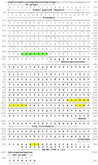 cDNA sequence and deduced amino acid sequence of BlatPII-c. The deduced amino acid sequence of the mature protein is depicted in bold letters and is preceded by the pro-domain, which contains the sequence PKMCGVT characteristic of the Cys switch (highlighted in green). Sequences corresponding to signal peptide, pro-domain, metalloproteinase domain, spacer region and the disintegrin domain are indicated. The sequences corresponding to the mutated zinc-binding motif and the sequence CIM (Cys-Ile-Met) of the Met-turn are highlighted in yellow, as well as the sequence RGD in the disintegrin domain. Cysteine residues proposed to be related to the lack of proteolytic processing of the disintegrin from the metalloproteinase domain are labeled with asterisks. Primers used to PCR-amplify the cDNA clone and the C-terminal amino acid sequence gathered by MS/MS analysis of a tryptic peptide are shown.