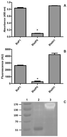 Evaluation of the proteolytic activity of BlatPII and other SVMPs on azocasein and gelatin. (A) BlatPII (5.5 µM) was incubated with azocasein (see the Materials and Methods for details). For comparison, an equimolar concentration of PI SVMP BaP1, from the venom of Bothrops asper, and of the hemorrhagic PII SVMP BlatH1, from the venom of Bothriechis lateralis, were also tested. PBS was used as a negative control; (B) Quantification of the gelatinolytic activity of the SVMP by a fluorescent commercial kit (EnzCheck® protocol Gelatinase/Collagenase Assay Kit, Molecular Probes, Life Technologies, Eugene, OR, USA). One-point-six micrograms of BlatPII were incubated with 20 µg of the fluorescent gelatin; equimolar quantities of BaP1 and BlatH1 were used as positive controls; samples were incubated at room temperature for 6 h. Fluorescence intensity was measured in the BioTek Synergy HT microplate reader using the absorption filter at 495 nm and the emission filter at 515 nm. * p < 0.05 when compared with BaP1 and BlatH1. In (A,B), the signal of BlatPII was not significantly different when compared to the controls without enzyme (p > 0.05); (C) Gelatin zymography: 2.5 µg of BlatPII (Lane 2) and 2.5 µg of BlatH1 (Lane 3) were separated on SDS-PAGE under non-reducing conditions. Lane 1 corresponds to molecular mass standards. The dark band observed in Lane 2 corresponds to BlatPII, whose migration in SDS-PAGE-gelatin gels is delayed as compared to SDS-PAGE gels without gelatin.
