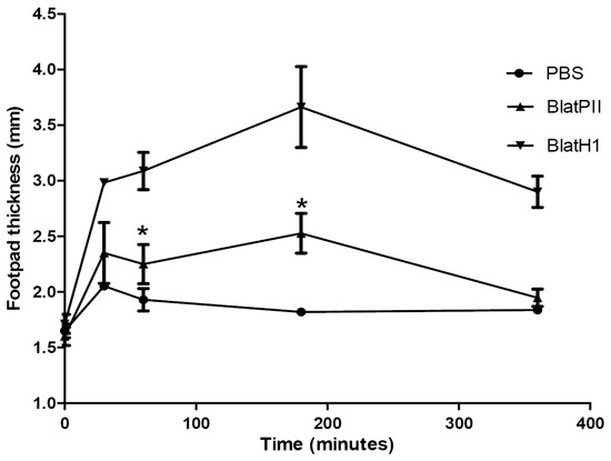 Edema-forming activity of BlatPII. Groups of four CD-1 mice were injected subcutaneously in the right footpad with 5 µg of BlatPII, in a volume of 50 µL PBS. Controls were injected with 50 µL PBS only. The paw thickness was measured using a low pressure spring caliper, as a quantitative index of edema, before injection and at 30, 60, 180 and 360 min after injection. Edema was calculated as the percentage of increase in the paw thickness of the right foot injected with SVMP as compared to the left foot; in parallel, 5 µg of BlatH1 were used as a positive control. BlatH1 induced significantly higher (p < 0.05) edema than BlatPII at all time intervals, whereas BlatPII induced a significant edema, as compared to the control, only at 60 and 180 min (* p < 0.05).