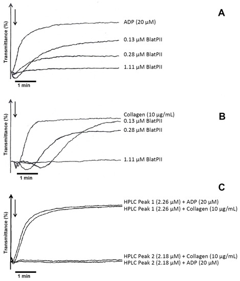 Inhibition of platelet aggregation by BlatPII and RP-HPLC Peaks 1 and 2. Various concentrations of BlatPII were tested using ADP (A) or collagen (B) as agonists. (C) Inhibition of platelet aggregation by HPLC Peak 1 and Peak 2. Results presented correspond to one experiment representative of three different independent experiments.