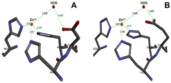 As described above, the clone codes for the sequence HDLGHNLCIDH instead of the characteristic canonical site HEXXHXXGXXH at the enzyme active site. Three-dimensional structures, based on homology models, were generated using the Modeller method available in the Accelrys Discovery Studio 3.5 software [17]. The vascular apoptosis-inducing protein 1 (VAP-1) (PDB Code 2ERQ) was used as a template. After aligning the generated model of the BlatPII-c with the VAP-1 crystal structure, it was shown that the substitution of Glu for Asp causes an increase in the distance between residue Asp335 and the water molecule (4.203 Å), both of which play a key role in the hydrolysis of the peptide bond. In the case of VAP-1, a PIII SVMP from the venom of Crotalus atrox, which has the characteristic active site with Glu, the distance between the water molecule and Glu is 2.691 Å (Figure 6). A PIII SVMP (VAP-1) was used as a model, because no PII SVMP has been crystallized, and the sequence identity percentage between these toxins is acceptable (55%) for the modeling program.