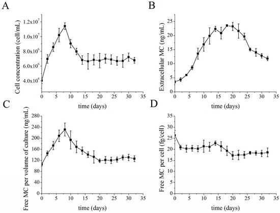 The extracellular MC concentration increased in the early stage of the growth, reached a maximum concentration of 23.56 ng·mL−1 on the eighteenth day, and then decreased during the stage of stable cell density (Figure 2B). The trend in free intracellular MC concentration per volume of culture was similar to that of the corresponding growth curve (Figure 2C). The free MC per cell was stable before the time period when 25% culture replacement was begun (except on day 0 when it was at its highest concentration). A slight decrease was observed early in the stable stage of culture density (Figure 2D).