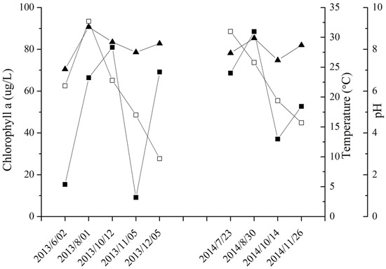 Environmental parameters in Meiliang Bay, N2, of Lake Taihu, from 2013 to 2014, chlorophyll a (■), temperature (□) and pH (▲).