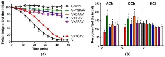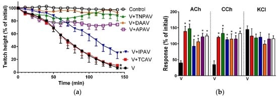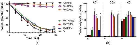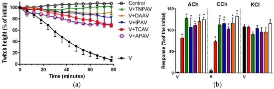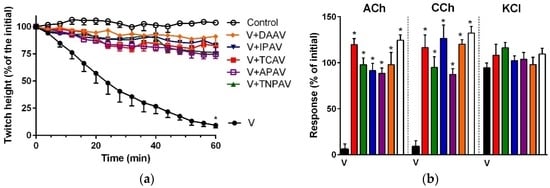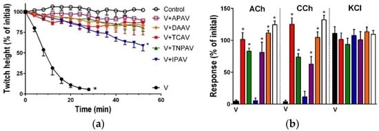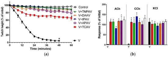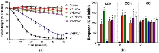 Cross-neutralisation of the neurotoxicity of Oxyuranus scutellatus venom (5 µg/mL, V, black) by Thai cobra antivenom (TCAV; red), Thai neuro polyvalent antivenom (TNPAV; green), Indian polyvalent antivenom (IPAV; blue), death adder antivenom (DAAV; orange), and Australian polyvalent antivenom (APAV; purple) in the chick biventer nerve-muscle preparation compared to control: (a) Prevention of the inhibition of indirect twitches caused by venom (V). Note: TCAV and IPAV failed to prevent neurotoxicity (twitch height as a percentage of the initial at 140 min is different from the control, one-way ANOVA followed by Bonferroni’s post-hoc test); (b) The effect of venom on the response to exogenous agonists (ACh, CCh and KCl) in the absence and the presence of antivenoms compared to controls. Note: all antivenoms prevented the inhibition of agonist responses by the venom (* significantly different from the venom, p < 0.05, one-way ANOVA followed by Bonferroni’s post-hoc test).