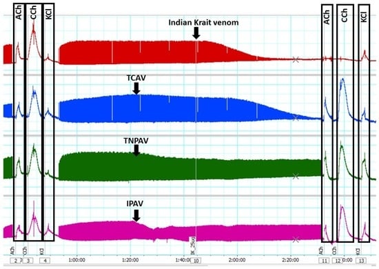 B. caeruleus venom (5 µg/mL) inhibited indirect twitches (Figure 1a and Figure 2) and abolished the response of the chick biventer preparation to exogenous nicotinic receptor agonists—acetylcholine (ACh) and carbachol (CCh)—indicating the venom had post-synaptic neurotoxicity (Figure 1b and Figure 2). Thai cobra antivenom (TCAV) did not prevent the inhibition of indirect twitches but prevented the abolition of the response of the chick biventer preparation to exogenous nicotinic agonists, indicating the neutralisation of post-synaptic effects, but not the pre-synaptic neurotoxicity of the venom. Indian polyvalent antivenom (IPAV), Thai neuro polyvalent antivenom (TNPAV), death adder antivenom (DAAV), and Australian polyvalent antivenom (APAV) all prevented the inhibition of indirect twitches, and the abolition of the response of the chick biventer preparation to exogenous nicotinic receptor agonists, indicating the neutralisation of both pre- and post-synaptic effects of the venom (Figure 1b and Figure 2).