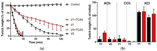 Cross-neutralisation of the neurotoxicity of 1 µg/mL vs. 5 µg/mL P. textillis venom by Thai cobra antivenom (TCAV; red): (a) Inhibition of indirect twitches caused by 1 µg/mL (V1) vs. 5 µg/mL (V5) P. textillis venom in the presence of TCAV. Note: TCAV does not prevent the twitch abolition caused by 1 µg/mL P. textillis venom (* significantly lower from the control at 120 min, p < 0.05, one-way ANOVA followed by Bonferroni’s post-hoc test); (b) The effect of 1 µg/mL (V1) vs. 5 µg/mL (V5) P. textillis venom on the response to exogenous nicotinic agonists (ACh, CCh and KCl) in the absence and presence of TCAV. Note: TCAV failed to prevent the abolition of agonist responses caused by 1 µg/mL venom (no significant difference from the venom, one-way ANOVA followed by Bonferroni’s post-hoc test).