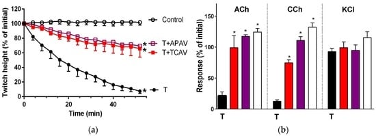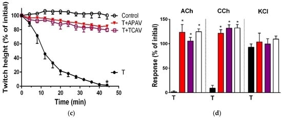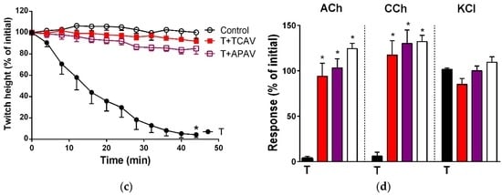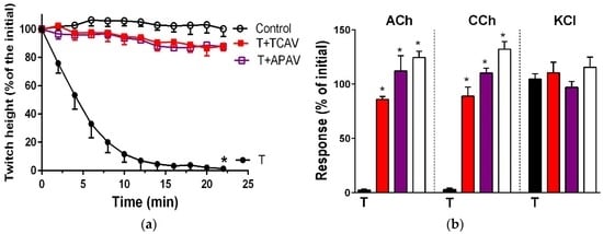 At a lower dose of P. textillis venom (1 µg/mL), the inhibition of indirect twitches was not prevented by TCAV (i.e., twitch height not different from the venom group at any time point; p < 0.05, unpaired t test; Figure 10a). Furthermore, the venom (1 µg/mL) mediated abolition of the response of the chick biventer preparation towards exogenous nicotinic receptor agonists was not prevented by TCAV (p < 0.05, one-way ANOVA followed by Bonferroni’s post hoc test; Figure 10b).