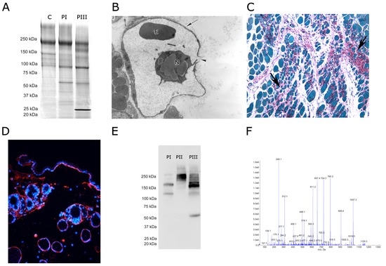 Experimental approaches to study the action of snake venom metalloproteinases (SVMPs) on the extracellular matrix (ECM). (A) In vitro analysis of hydrolysis of ECM proteins by SVMPs. Basement membrane (BM) preparations, such as Matrigel in this figure, or isolated ECM proteins, are incubated with SVMPs and the mixture is then analyzed by SDS-PAGE to assess the cleavage products; C: control Matrigel; degradation induced by PI and PIII SVMPs is shown. Molecular mass markers are shown to the left (reproduced from [31], copyright 2006 Elsevier); (B) Transmission electron microscopy assessment of ECM damage by analyzing the alterations in tissues from animals injected with SVMPs. A disrupted capillary vessel with damage to BM is shown after the injection of a hemorrhagic SVMP; 10,000 × (reproduced [50], copyright 2006 Elsevier); (C) Histochemical assessment of collagen degradation. A histology section of muscle tissue stained with Sirius Red, which stains collagen, and Fast Green, which stains proteins, is shown; 200 × (reproduced from [14], copyright 2011 PLOS); (D) Immunohistochemistry staining of a sample of skin injected with a SVMP. The blue staining corresponds to Hoechst 33258, which stains nuclei, whereas the red staining corresponds to immunostaining with a monoclonal antibody against type IV collagen; 400 ×; (E) Western blotting analysis of type VI collagen in samples of exudates collected from tissue injected with PI, PII and PIII SVMPs. Different patterns of hydrolyzed fragments are observed. Molecular mass markers are depicted to the left (reproduced from [24], copyright 2015 PLOS); (F) Mass spectrometry analysis of proteins in exudates collected in the vicinity of tissue injected with SVMPs allows the identification of degradation products of many types of ECM proteins. A mass spectrum is shown for illustrative purposes.