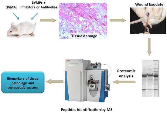 - Rucavado, A.; Escalante, T.; Shannon, J.; Gutiérrez, J.M.; Fox, J.W. Proteomics of wound exudate in snake venom-induced pathology: Search for biomarkers to assess tissue damage and therapeutic success. J. Proteome Res. 2011, 10, 1987–2005. [Google Scholar] [CrossRef] [PubMed]