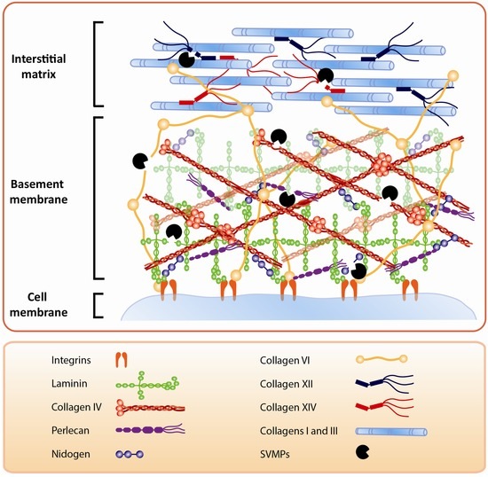 Several aspects of the local pathological effects induced by SVMPs have been studied, such as the microvascular damage leading to hemorrhage [15,16], skeletal muscle necrosis and poor muscle regeneration [13,14,17], blistering, and dermonecrosis [18,19], as well as the identification of inflammatory mediators responsible for pain, edema, and leukocyte infiltration [20,21,22]. To a great extent, these alterations are considered to be associated in some manner with the action of SVMPs on the extracellular matrix (ECM). However, the specific effects induced by SVMPs as a result of their action on ECM have been investigated only to a limited extent, being mostly focused on the structural damage to basement membrane (BM) components of capillary blood vessels [15,16,23,24]. The reasons behind the paucity of information in this aspect of envenoming have to do mostly with methodological limitations and to the complexity of ECM structure and function. In his celebrated book The Logic of Life, François Jacob stated “The alternative approach to the history of Biology involves the attempt to discover how objects become accessible to investigation thus permitting new fields of science to be developed” [25]. It is then relevant to discuss how the alterations in ECM by snake venoms and SVMPs have become accessible to investigation.
