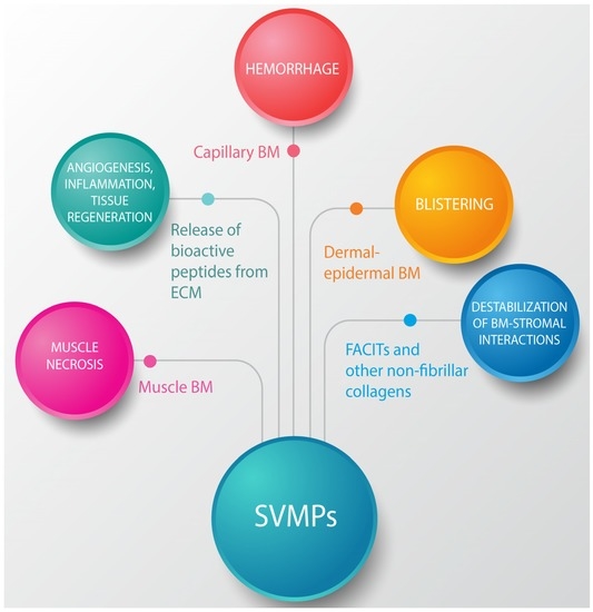 Hydrolysis of ECM components by SVMPs. Some SVMPs hydrolyze components at the BM of capillary vessels, skeletal muscle fibers, and dermal-epidermal junction. In the case of hemorrhagic SVMPs, it has been postulated that hydrolysis of type IV collagen is a key step in the destabilization of BM, which leads to extravasation. SVMPs also hydrolyze additional ECM proteins, such as FACITs, type VI collagen, and other components that connect the BM with the surrounding matrix stromal proteins. Moreover, SVMP degrade proteins that bind to and organize fibrillar collagens, leading to a disorganization of the ECM supramolecular structure. SVMPs may also hydrolyze plasma membrane components, such as integrins, that interact with BM components. All these hydrolytic actions result in a profound alteration of ECM, with consequences for the processes of venom-induced tissue damage, repair, and regeneration.