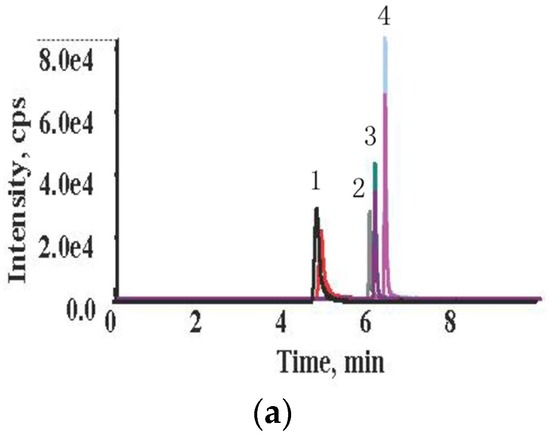 MRM chromatograms of (a) the four Alternaria toxins standards at concentrations of 250 μg/kg for TeA, 50 μg/kg for AOH, 50 μg/kg for TEN and 25 μg/kg for AME; (b) a naturally contaminated wheat sample with 112.9 μg/kg for TeA, 8.8 μg/kg for AOH, 3.3 μg/kg for TEN and negative for AME. 1 = TeA; 2 = AOH; 3 = TEN; 4 = AME.