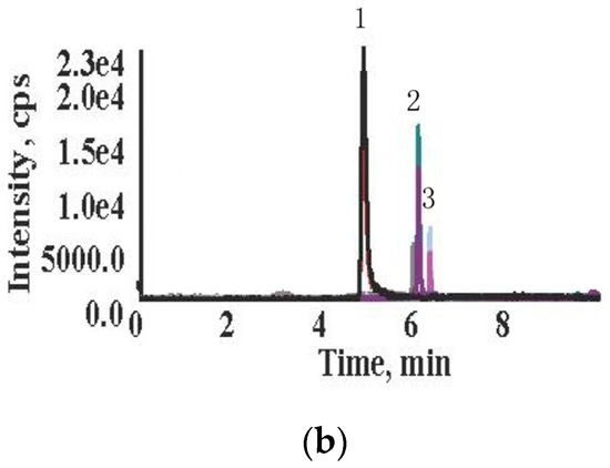 The MS was operated in the negative electrospray ionization (ESI−) mode, set as MRM with an optimized dwell time of 50 ms. The curtain gas was set to 35 psi, the collision gas to 7 psi, Gas1 to 60 psi and Gas2 to 50 psi. The source desolvation temperature was 600 °C. The ion spray voltage was −4500 V in negative mode. Parent and fragment ions (quantifier and qualifier) for each analyte were determined based on the optimal signal-to-noise ratios in a spiked sample. The parent ions (m/z) for TeA, TEN, AOH and AME are 196.0, 413.2, 256.9 and 270.9, respectively. The most intense product ion was employed for quantification, and the less intense signals were used for confirmation of toxin identity. The quantitative/qualitative daughter ions are 138.8/111.8 for TeA, 140.9/271.0 for TEN, 212.9/214.9 for AOH and 255.8/227.8 for AME, respectively (see Supplementary Table S2).