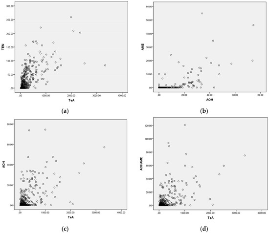 Co-occurrence of the four Alternaria toxins in wheat samples was frequent: 19% of samples (72/370) were contaminated by all four toxins, 30% (110/370) by three toxins, 46% (170/370) by two toxins and 5% (18/370) by only one toxin (TeA). Regarding the co-occurrence of the three toxins, 53 (48%, 53/110) samples were positive for TeA, TEN and AME, 20 (18%, 20/110) samples for TeA, TEN and AOH, 19 (17%, 19/110) samples for TeA, AOH and AME, and 18 (16%, 18/110) samples for TEN, AOH and AME, respectively. In terms of wheat co-contamination by the two Alternaria toxins, TeA and TEN was the most frequent combination detected in 60 (35%, 60/170) samples, followed by TeA and AME as well as TEN and AME, with the prevalence of 21% (35/170) for both combinations (Table 4). TeA and AOH occurred together in 14 (8%, 14/170) samples, whereas both AOH with TEN and AOH with AME in 13 (8%, 13/170) samples, respectively. Moreover, a significant linear correlation in concentrations was observed between TeA and TEN (r = 0.675, p < 0.05), AOH and AME (r = 0.558, p < 0.05), TeA and AOH (r = 0.407, p < 0.05), and also the total dibenzopyrone derivatives (AOH + AME) and TeA (r = 0.431, p < 0.05), respectively (Figure 3). These results are similar to those reported by Zhao et al. [19], of which a significant linear correlation in toxin concentration was found between AOH and AME (r = 0.877, p < 0.01), TeA and TEN (r = 0.747, p < 0.01), and the total dibenzopyrone derivatives (AOH + AME) and TeA (r = 0.860, p < 0.01).