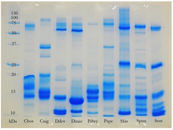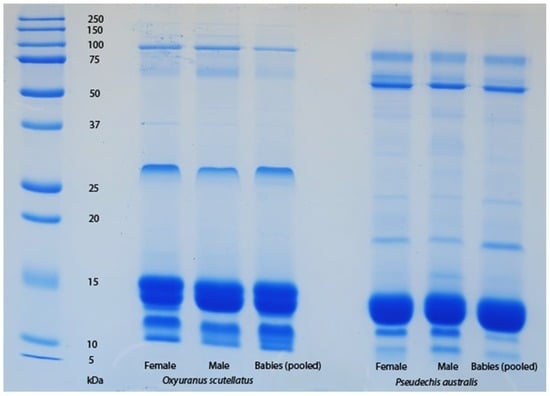 In total, 21 classes of toxin were recovered, by “shotgun” MS/MS of crude venoms and MS/MS of gel spots, from the venoms of 28 species of Australian elapid snake (