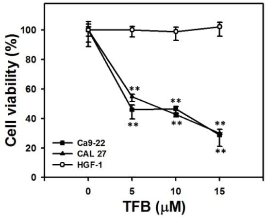 ATP content has been widely used to measure cell viability [24,25]. Figure 1 shows the ATP assay of cell viability after 24 h of treatment with TFB (0, 5, 10, and 15 μM). The viability of TFB-treated oral cancer cells (Ca9-22 and CAL 27) decreased dose-responsively (p < 0.001). In contrast, the normal oral cells (HGF-1) maintained a cell viability of about 100%.