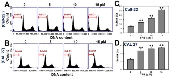 To examine whether the cell cycle was affected by TFB, the cell cycle progression was examined. Figure 2A,B show dose-responsive pattern changes of the cell cycle progression of TFB-treated Ca9-22 and CAL 27 cells, respectively. The subG1 population in TFB-treated Ca9-22 and CAL 27 cells increased in a dose-responsive manner after 24 h of THB treatment (Figure 2C,D) (p < 0.001).