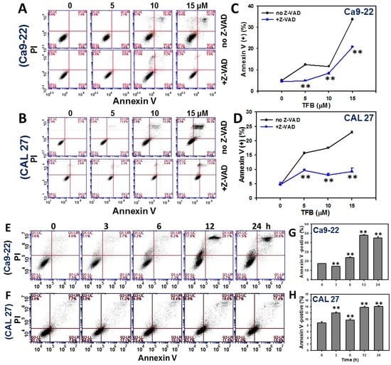 TFB induced annexin V-based apoptosis in oral cancer Ca9-22 and CAL 27 cells. (A,B) Representative flow cytometry-based dose response of apoptosis profiles of annexin V/PI double staining for TFB-treated Ca9-22 and CAL 27 cells. Cells were treated with 0, 5, 10, and 15 μM TFB for 24 h with or without 0.1 mM Z-VAD-FMK treatment for 2 h. (C,D) Quantification analysis results for apoptosis positive (%) in (A,B). Data: mean ± SD (n = 3). ** p < 0.001, comparing the Z-VAD-FMK to the non-Z-VAD-FMK for each TFB dose. (E,F) Representative time course of annexin V-based apoptosis profile in TFB-treated Ca9-22 and CAL 27 cells using flow cytometry. Cells were treated with 15 μM TFB for 3, 6, 12, and 24 h. (G,H) Quantification analysis results for annexin V-based apoptosis in (E,F). The regions of annexin V (+) including annexin V (+)/PI (+) and annexin V (+)/PI (−) were analyzed. Data: mean ± SD (n = 3). ** p < 0.001 compared to the control.