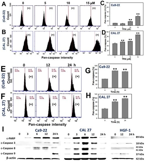 Figure 4E,F show the patterns of time course changes of pancaspase intensity profiles of TFB-treated Ca9-22 and CAL 27 cells. The pancaspase intensities in TFB-treated Ca9-22 and CAL 27 cells increased in a time-dependent manner (Figure 4G,H) (p < 0.001). Moreover, Figure 4I shows the protein expressions of apoptosis signaling proteins, such as cleaved-poly (ADP-ribose) polymerase (PARP) and cleaved-caspases 3 and 8 gradually increased over 3–24 h and cleaved-caspase 9 was detected at 24 h in TFB-treated Ca9-22 cells. In TFB-treated CAL 27 cells, the protein expressions of cleaved-PARP and cleaved-caspases 3, 8, and 9 gradually increased from 3 to 6 h, moderately increased at 12 h, and declined at 24 h. In contrast, these apoptosis signaling proteins in TFB-treated HGF-1 were weak.