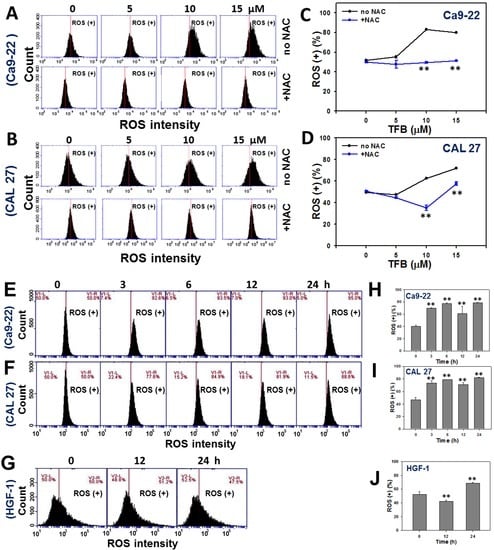 Figure 5E–G show the time course pattern changes of ROS intensity profiles of TFB-treated Ca9-22, CAL 27, and HGF-1 cells, respectively. The ROS intensities in TFB-treated Ca9-22 and CAL 27 cells dramatically increased in a time-dependent manner (Figure 5H,I) (p < 0.001). In contrast, ROS intensities in HGF-1 cells increased only slightly after 24 h of THB treatment (Figure 5J).