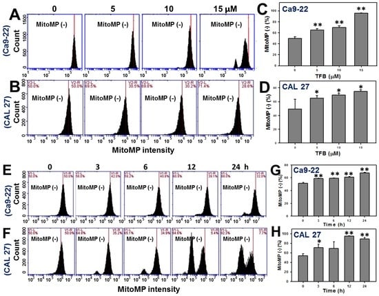 Figure 6E,F show the time course pattern changes of MitoMP intensity profiles of TFB-treated Ca9-22 and CAL 27 cells. The MitoMP-negative intensities in TFB-treated Ca9-22 and CAL 27 cells increased in a time-dependent manner (Figure 6G,H) (p < 0.001), suggesting that MitoMP levels of Ca9-22 and CAL 27 cells decreased after TFB treatment.