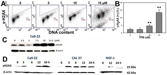 Treatment with TFB induced γH2AX expressions in oral cancer Ca9-22 and CAL 27 cells. (A) γH2AX expression of TFB-treated Ca9-22 cells was detected by flow cytometry. Cells were treated with 0, 5, 10, and 15 μM TFB for 24 h. (B) Quantification analysis of γH2AX positive (%) intensity of flow cytometry in (A). Data: mean ± SD (n = 3). ** p < 0.001 compared to the control. (C) Dose response of γH2AX expression of TFB-treated Ca9-22 cells was detected by Western blotting. The β-actin was used as an internal control. (D) Time course of γH2AX expression of TFB-treated Ca9-22, CAL 27, and HGF-1 cells was detected by Western blotting. Oral cancer cells were treated with 15 μM TFB for 0, 3, 6, 12, and 24 h. HGF-1 cells were treated with 15 μM TFB for 12 and 24 h.