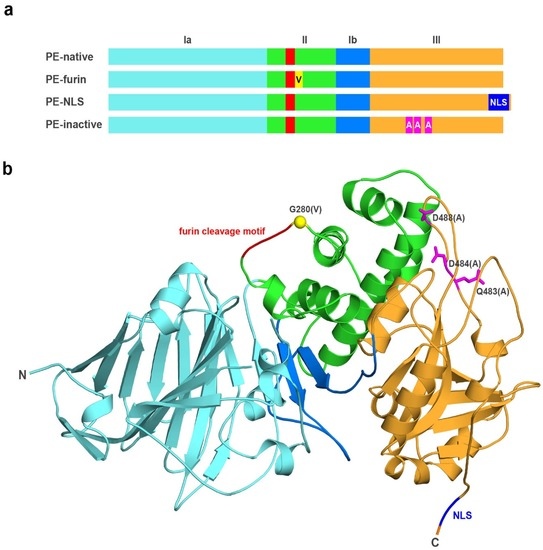 Figure 1. (a) Schematic overview; and (b) 3D structure of the analyzed toxins. PE comprises of three domains: I (Ia (light blue) and Ib (blue)); II (green); and III (orange). The furin cleavage motif (red) is located within the domain II. PE-furin possesses a single point mutation (G280V, yellow), which renders it resistant to furin cleavage. PE-NLS is characterized by the presence of NLS sequence (RRRKPPPRR, dark blue) incorporated at the C-terminus of PE. PE-inactive includes three point mutations (Q483A, D484A and D488A, magenta), which abolish its ADP-ribosylation activity.