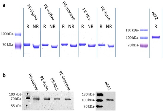 Figure 2. Purified toxins and eEF2: (a) Coomassie-stained SDS-PAGE gels with 2 μg of the analyzed proteins under reducing (R) and non-reducing (NR) conditions. PE-Sigma (Sigma Aldrich, St. Louis, MO, USA) was used as a control. (b) Western blots with anti-Exotoxin A and anti-eEF2. One hundred nanograms of each protein was used for WB analysis.