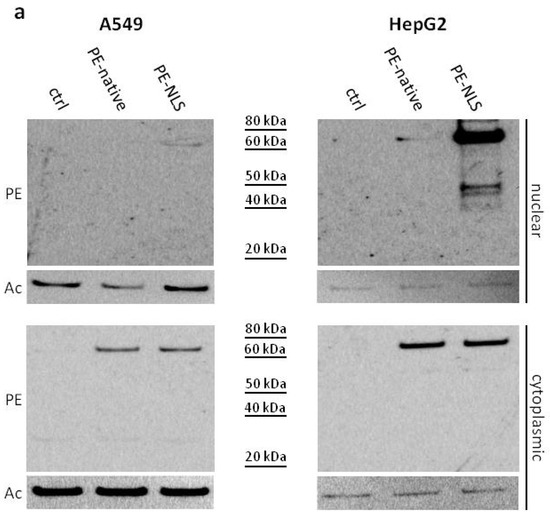 Initially, using Western blot, we analyzed the presence of PE-native and PE-NLS in nuclear fractions of A549 and HepG2 cells. We confirmed significant accumulation of PE-NLS in nuclear fractions, especially in HepG2 cells (Figure 3a). Preferential accumulation of PE-NLS in HepG2 cells might be explained by lower doubling time of these cells resulting in a slower process of dilution of the toxin. Interestingly, smaller amounts of PE-native, in both A549 and HepG2 nuclei, were also detected. This is consistent with the recent study by Chaumet et al. on the mechanism of PE transfer inside the cell, showing new endosomal route that transports cell surface receptors to the nucleoplasm [33]. The authors found that PE is located in the nuclear envelope-associated vesicles (NAE) (vesicles associated with nuclear endosomes and derived from early endosomes) and postulated sporadic release of the NAE content into the nucleus. It would explain small amounts of PE-native in the nucleus detected in our study.