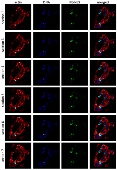 Figure 4. Localization of PE-NLS in HepG2 cells. Cells, intoxicated with fluorescently labeled PE-NLS (green), were fixed 3 h after treatment and monitored using confocal microscope. The nuclei were labeled with NucRed Live 647 ReadyProbes Reagent (blue), actin was labeled with Alexa Fluor 594 Phalloidin (red). The cells were visualized by confocal microscopy at 60× magnification of the objective.